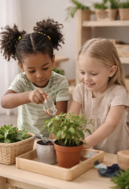 Instead of brightly coloured plastic toys everywhere, you might see children pouring water from small jugs, carefully sorting objects on trays, preparing their own snack or working quietly with hands-on materials that introduce early maths and language concepts.