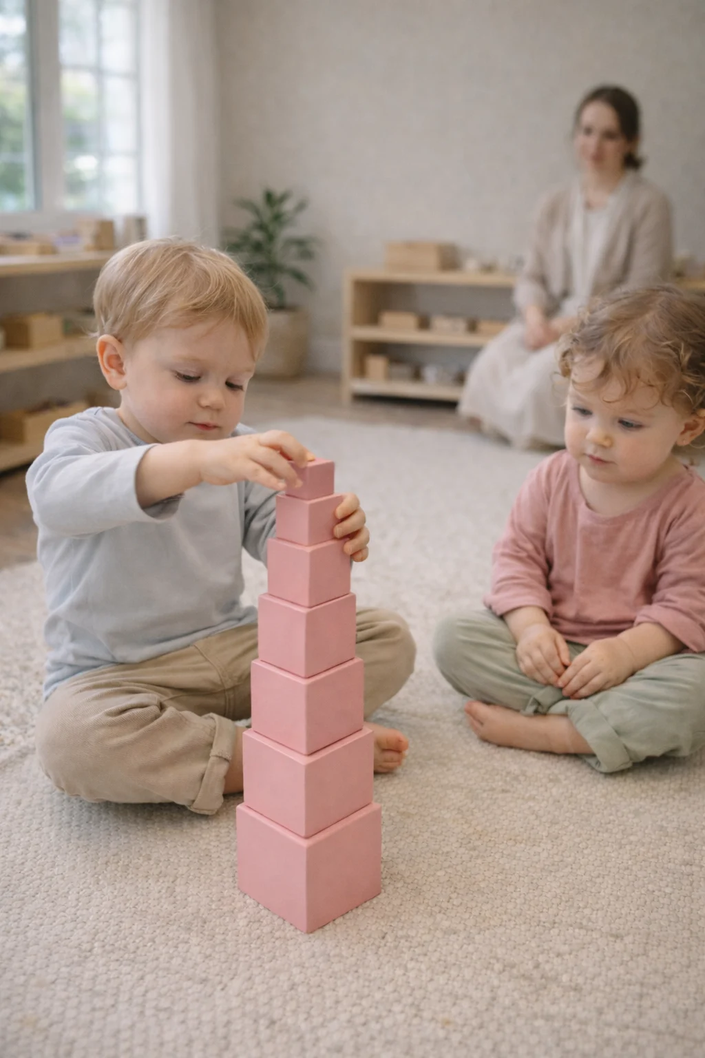 In practice this might mean a toddler learning how to carry a drink carefully across the room, or a three-year-old becoming deeply focused while working with shapes and materials that introduce early mathematical thinking.