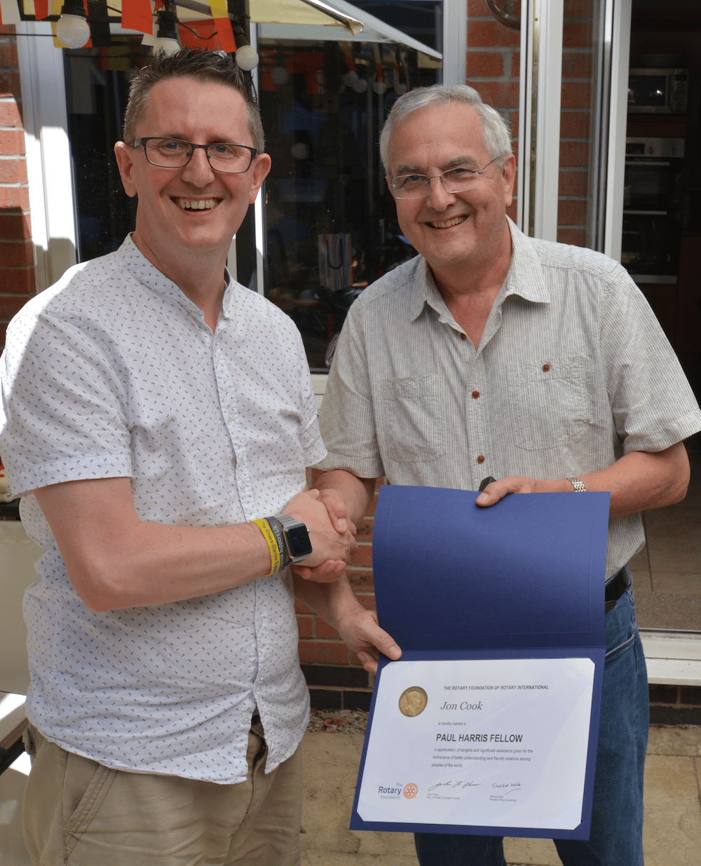 The photograph shows Jon being presented with the Fellowship by Rotarian John Lockley at the recent award ceremony.