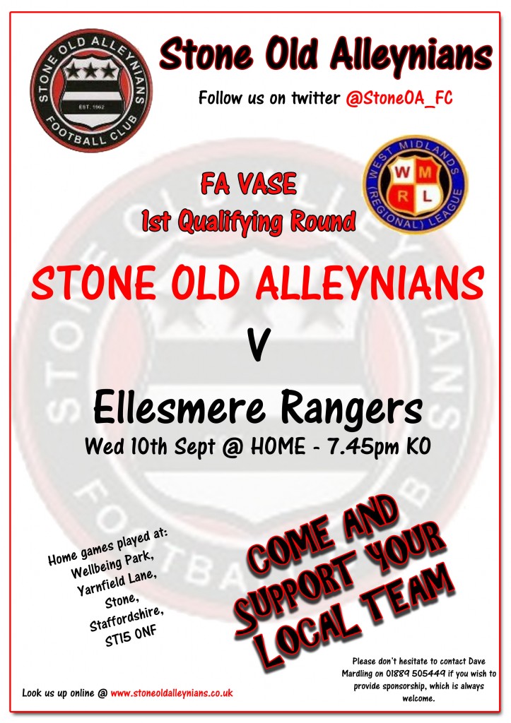 Following Stone Old Alleynians’ 2-2 extra-time draw with Ellesmere Rangers in the FA Vase on Saturday (see the match report) , Old Boys manager Matthew Smith has called on local supporters to attend the replay on Wednesday night and give his side a boost.
