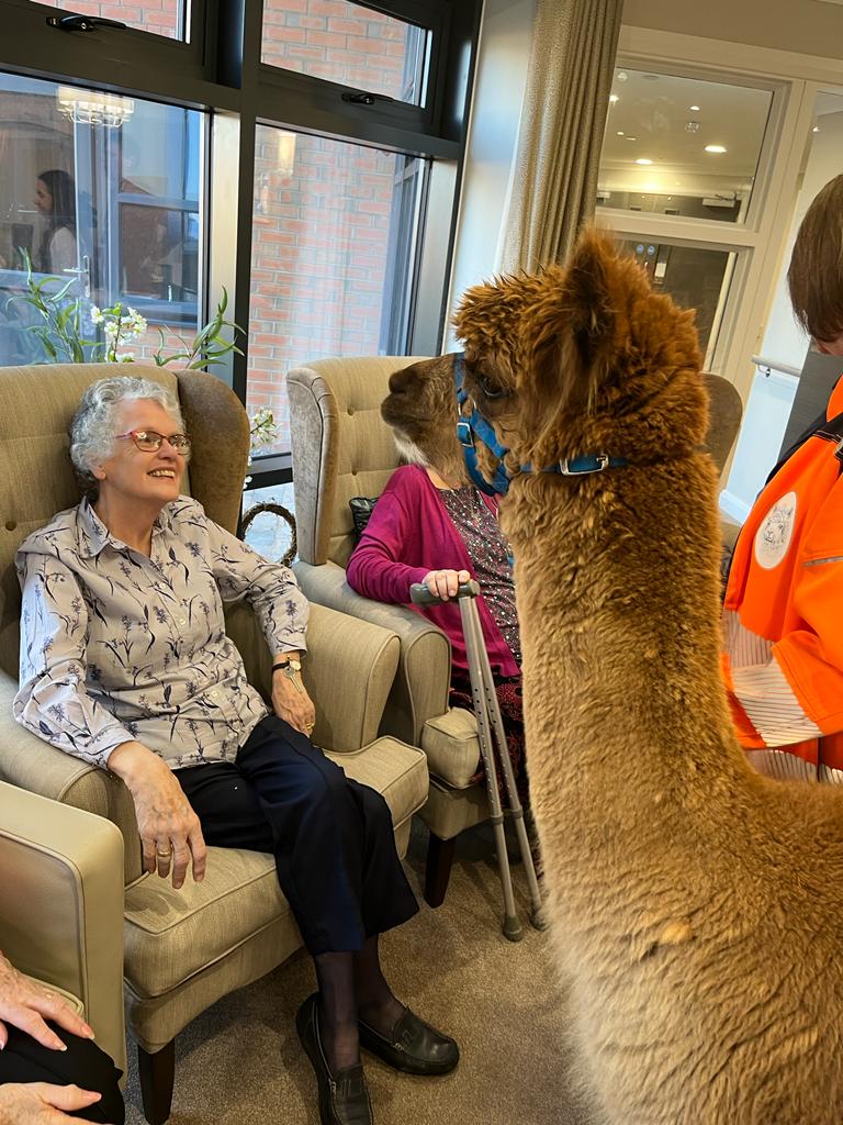 The visit from Teddy and Carlos was a unique and memorable experience for the residents at Shoemaker Place. Brenda, one of the residents, said ‘they were lovely and so well-behaved. I’ve seen an alpaca before, but not as close as this. I hope we can see them again!’