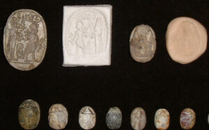 Highlights include some wonderful alabaster vessels and a collection of Royal Scarabs, beetle-like seals with the cartouches of the monarchs etched into them. Another very rare artefact is a ring with the name of Akhenaten, who was a radical leader and outlawed all the gods except for the Sun-God Aten. When he died the priests reverted to their old ways and his name was removed from the monuments and the temples – an item bearing this pharaoh’s name is a great rarity.