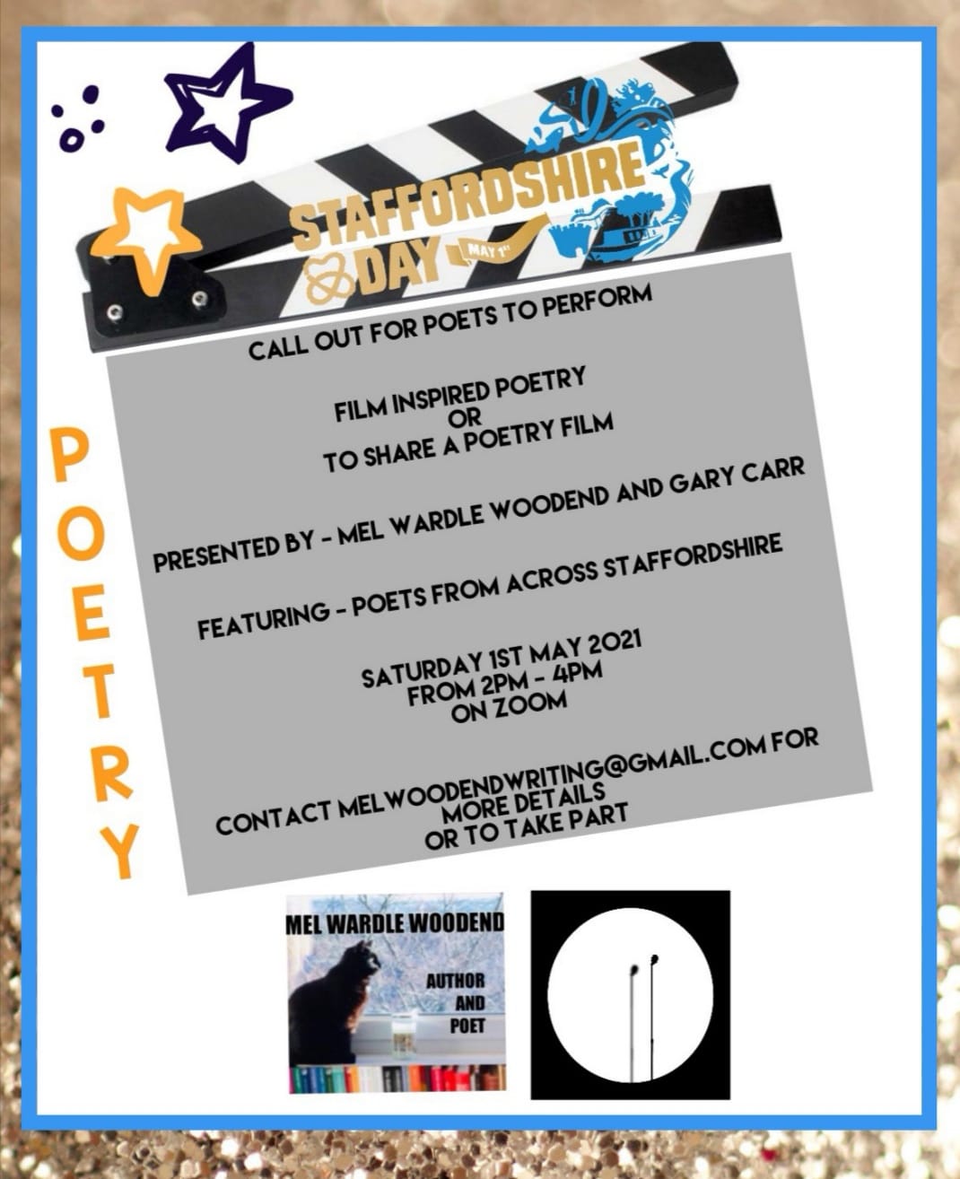 Alongside Mel’s own work, she and fellow Poet Gary Carr will also be bringing together some of the county’s top poets for a poetry extravaganza on Zoom on Saturday 1 May between 2pm-4pm. People will be able to sign up for the event and hear from local poets sharing poetry films they have made and also reading poems on the theme of ‘Film’.