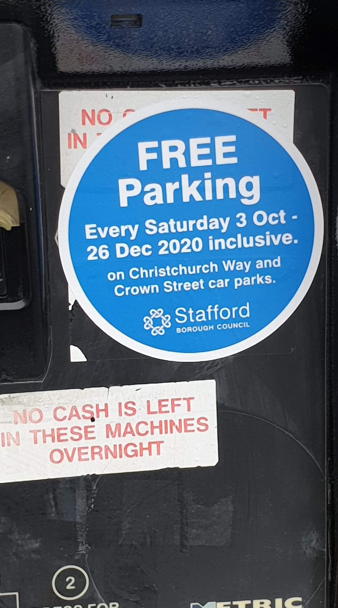 Stafford Borough Council produced stickers like this and placed them on the machines, they, however, did not in any way stop the machines from taking payment, either in cash or via their phone parking app. This means that people who miss the stickers can still end up paying for their parking and we’ve heard lots of reports of people doing just that.