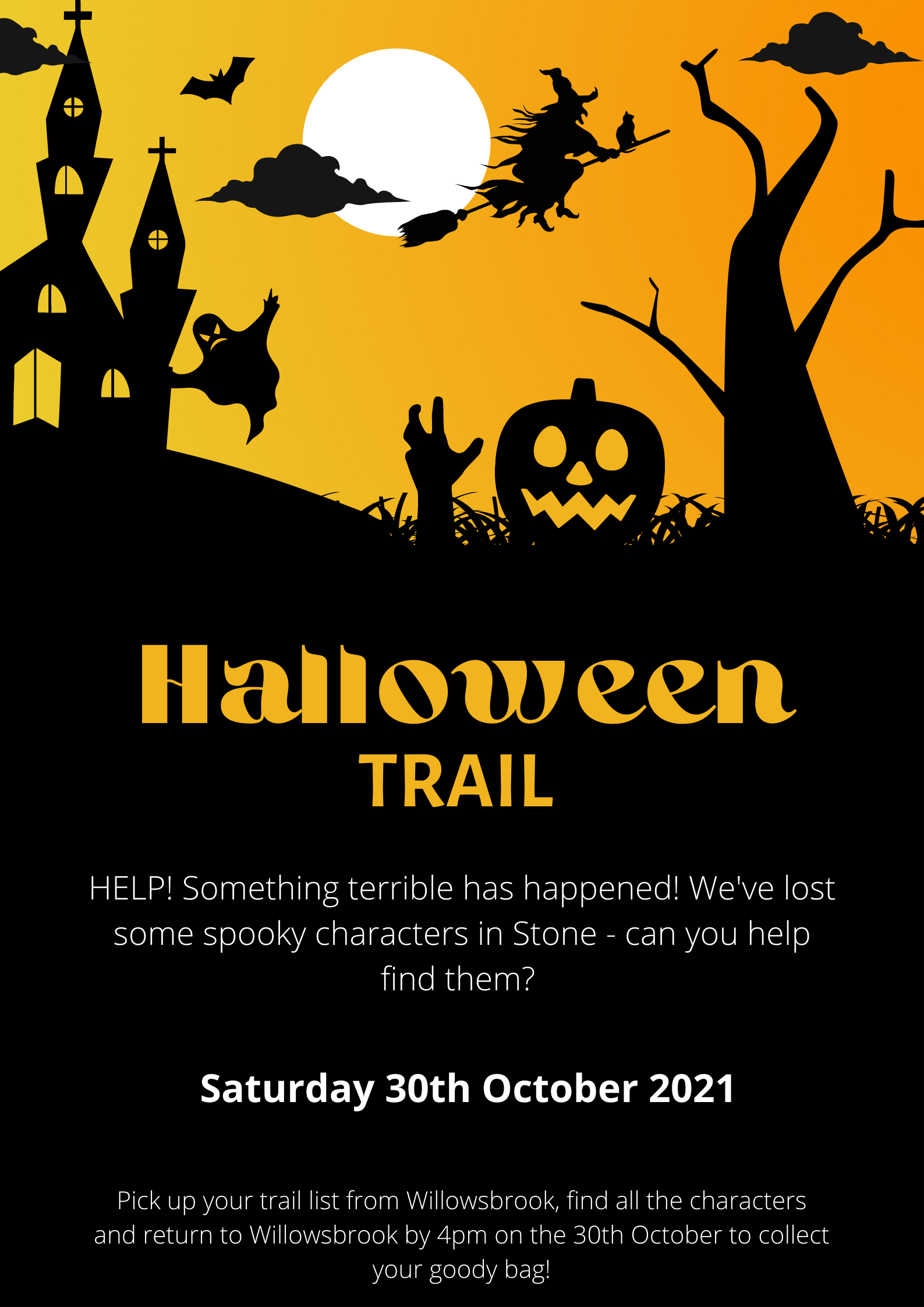 Collect your trail form from Willowsbrook at any time during the day and then head out around the High Street looking for all of the Halloween trail characters that have been placed around the town. Once you’ve completed the trail, head back to Willowsbrook before 4pm, to collect a goody bag for finishing!