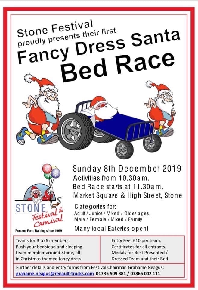 On Sunday 8th December, Stone High Street will be taken over by the Stone Festival team to host a Fancy Dress Santa Bed Race – entry slots available!