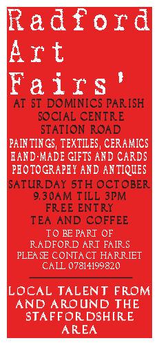 The first Radford Art Fair takes place on Saturday 5th October, so if you’re in town for the Stone Food and Drink Festival, pop along to St Dominic’s Social Centre on Station Road.