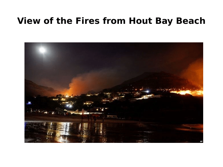 [dropcap]T[/dropcap]he Cape Peninsula was in the grip of raging wildfires in early March, stretching many miles from the Indian Ocean up and over the Table Mountain National Park to the Atlantic Ocean – and to us living here in Hout Bay.