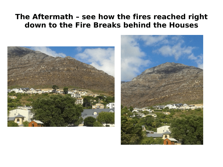 The fires ravaged the mountains and the forests over six days and the loss of forests, together with foliage and wildlife in the area has been enormous. Some property, including a local hotel, also perished. Three firemen tragically lost their lives. Two annual international sports events – The Argus Cycle Tour and The Two Oceans Marathon, have since had to be re-routed as the damage to the mountains threatens cyclists and runners not only with rock falls, but mud slides during rainfall.