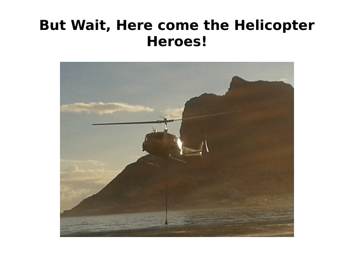 It’s tough work and three or four helicopters may work tirelessly together as a team all day and into the early evening. Since the fires were spread over many miles and there were only a limited number of helicopters available, a spotter plane flew up and down the peninsula, directing the helicopters by radio from one ‘hot spot’ to another.”