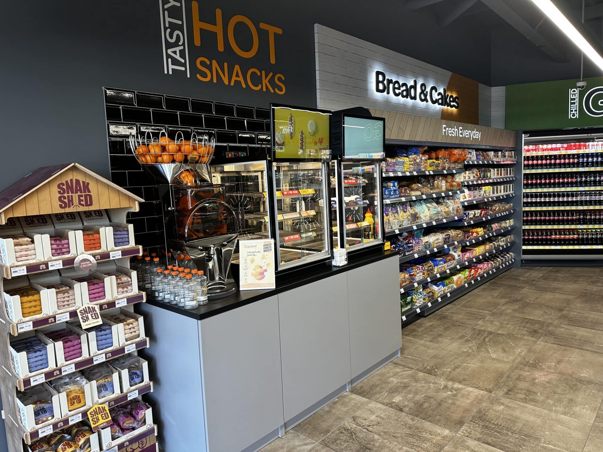 The forecourt shop is a full SPAR convenience store, offering chilled and frozen groceries (with well-known brands like Greggs, Iceland and COOK), fresh bread and snacks, and car care essentials. There’s also a coffee machine and a self-serve orange juice press.