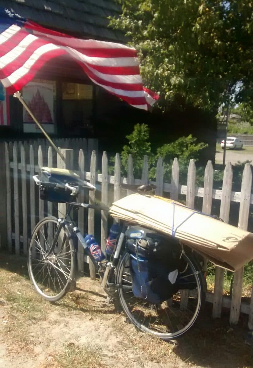 In most of those places, the bike came into the house as well. Of course I’d be devastated if it was actually stolen. My bicycle, a made-to-measure Longstaff, built locally in Chesterton, ran absolutely perfectly. I had only one puncture in the whole journey and not a single other mechanical issue at all. The rear tyre did wear out, though. The canvas was showing through by the time I arrived in Canada. I’m glad to say that the bike has made it home safely, with me. A kind man in a Boston bike shop gave me a spare cardboard box and once I’d pedalled to the airport I unbolted a few bits and pieces and managed to squeeze the bike inside.