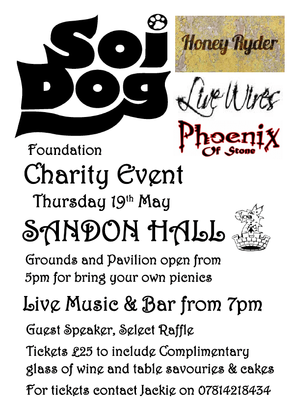 Local bands Honey Ryder, Live Wires and Phoenix are set to take to the stage in the impressive grounds of Sandon Hall on Thursday 19th May to raise money for the Soi Dog Foundation.