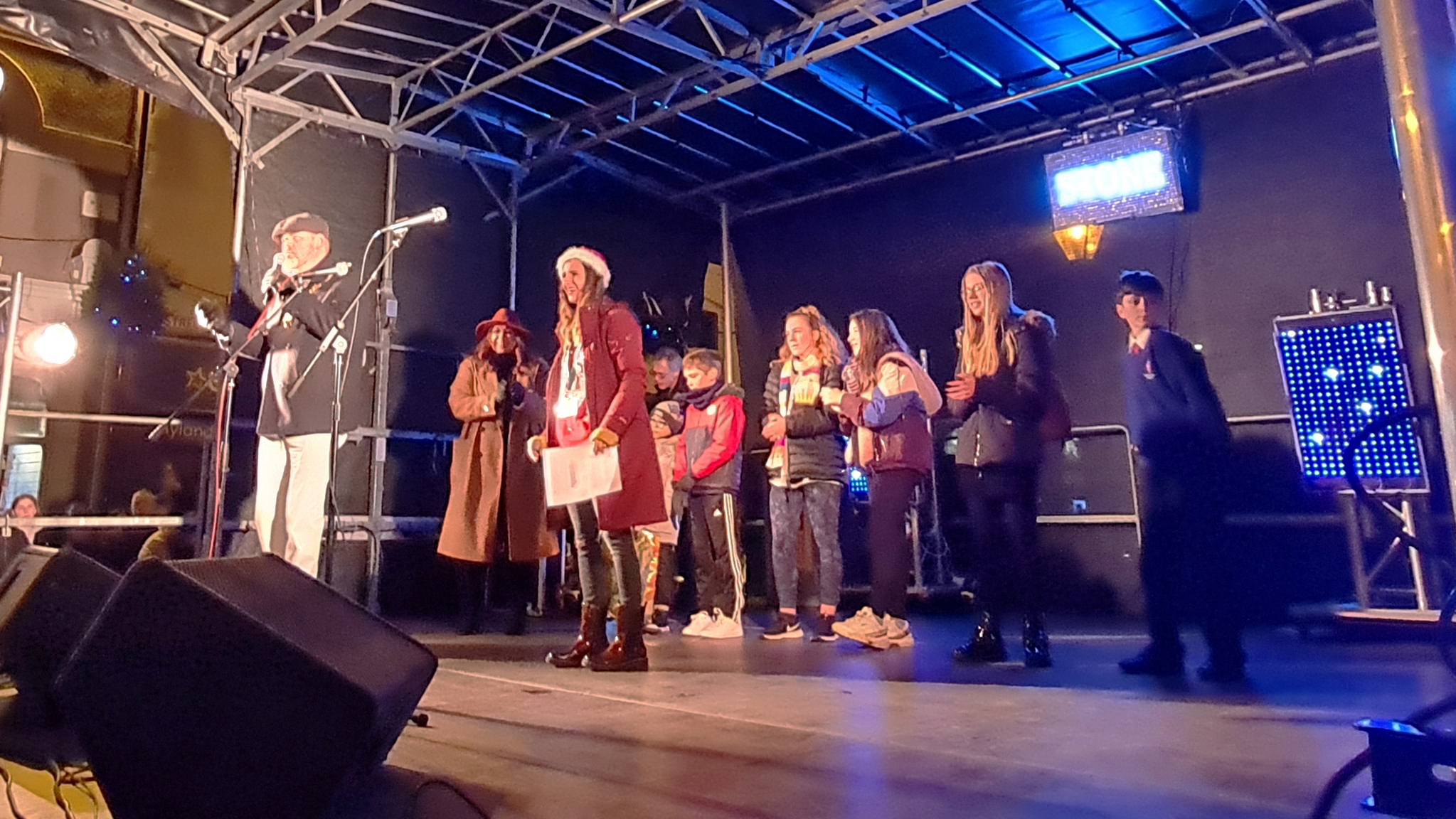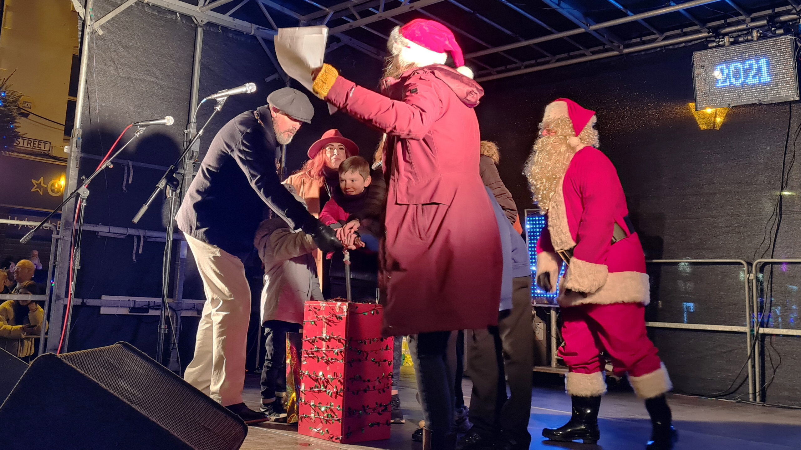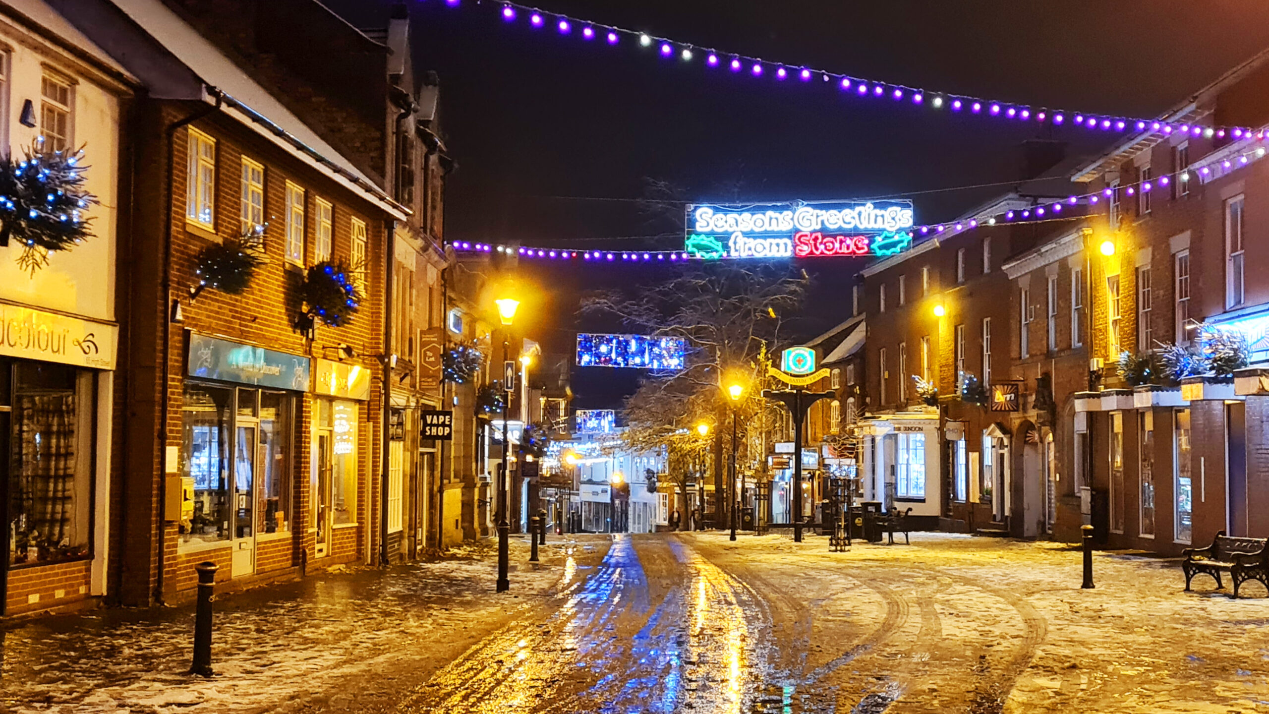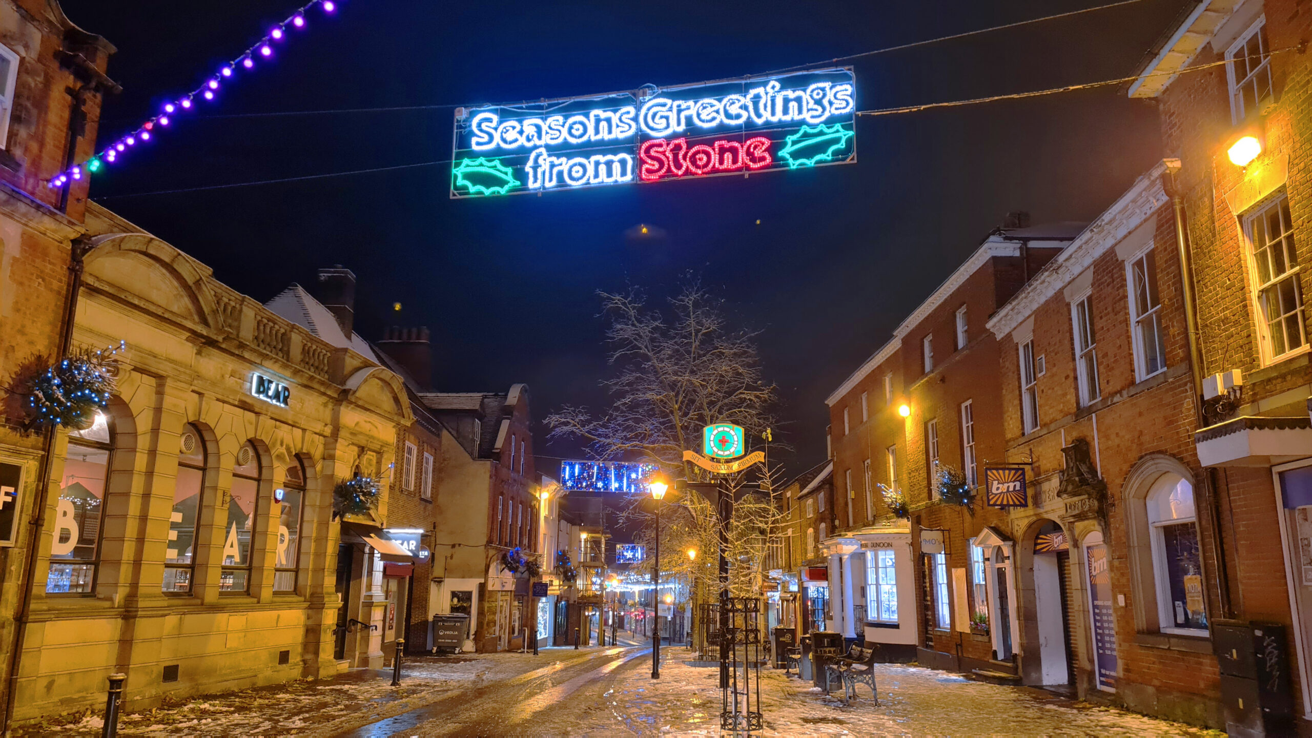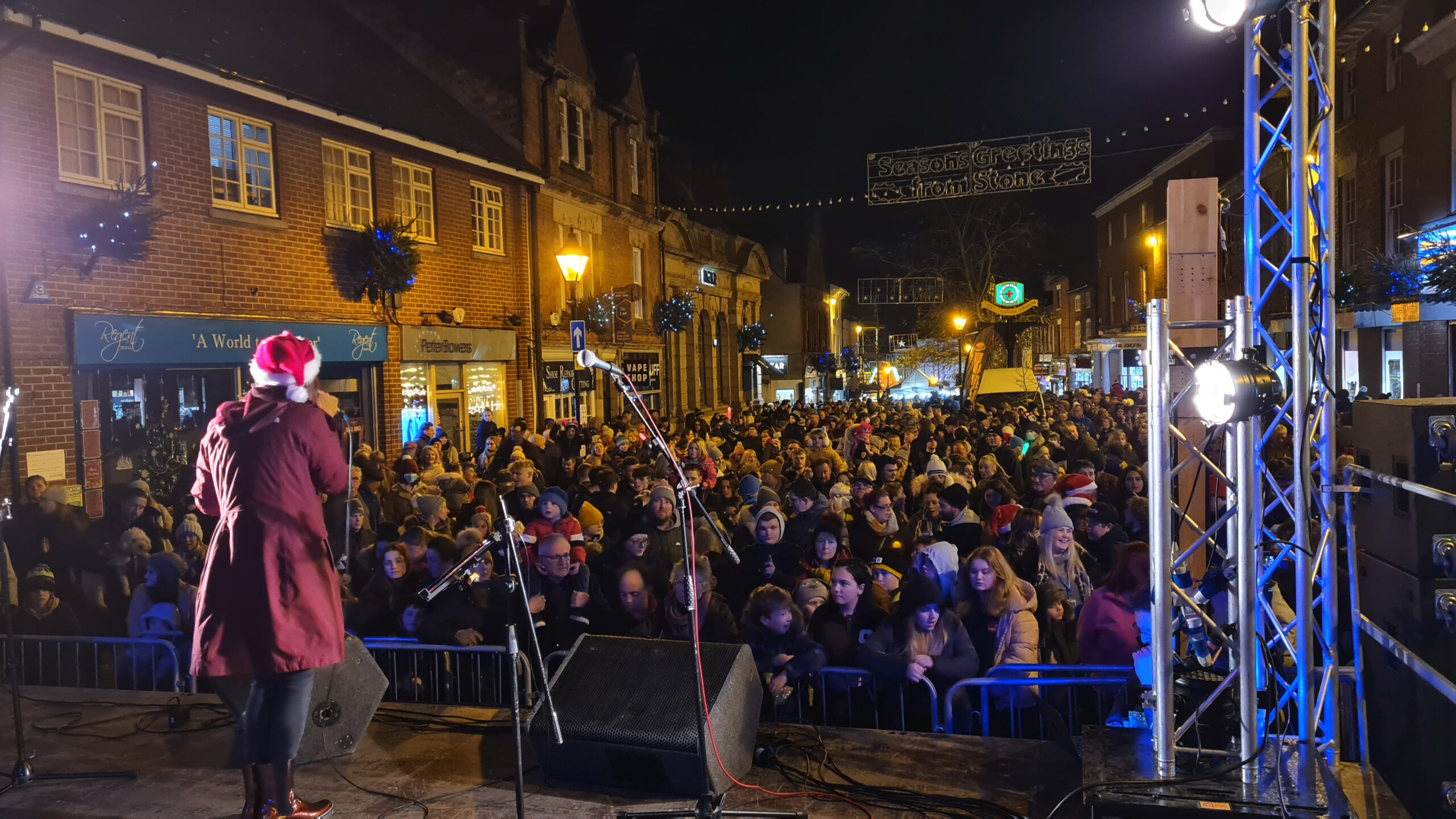 Large crowd gathered on Stone High Street at night, under the illuminated “Seasons Greetings from Stone” sign, with snow effects falling.