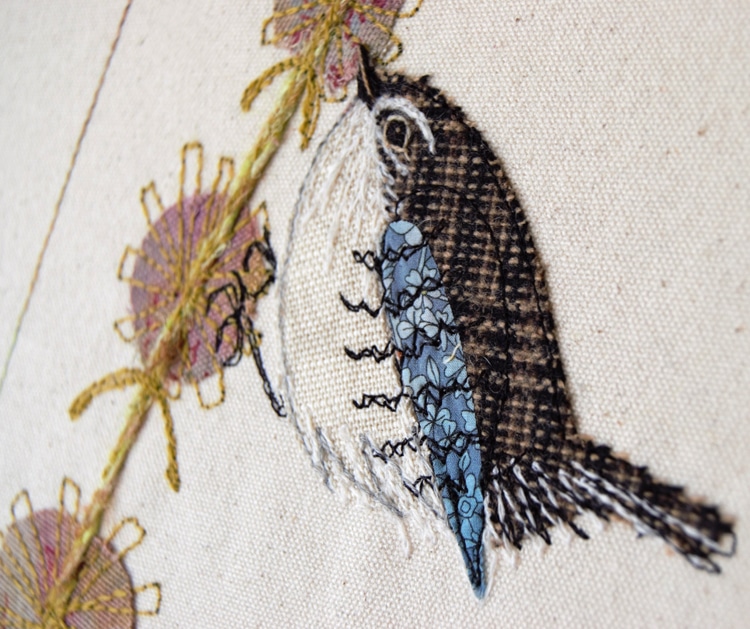 Jo, who has always lived and worked in Staffordshire, says, “Living in this lovely county is a constant source of inspiration for me, from the huge variety of birds that visit my garden, to the fallow deer on Cannock Chase. I love to interpret their colours and textures in a range of glorious fabrics coupled with fine, detailed stitching in my unique style.”