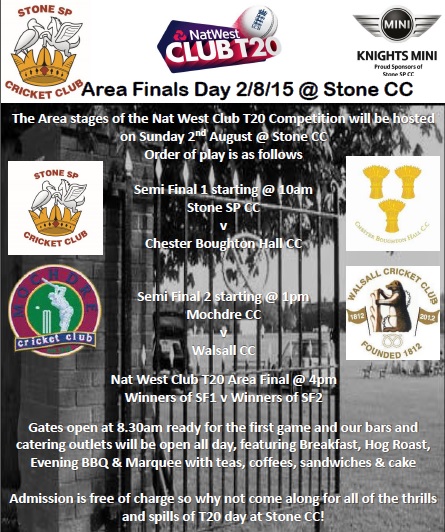 There’s a fantastic day of cricket at Stone Cricket Club on Sunday (2nd August) as the club hosts the area finals of this year’s NatWest Club T20 trophy.