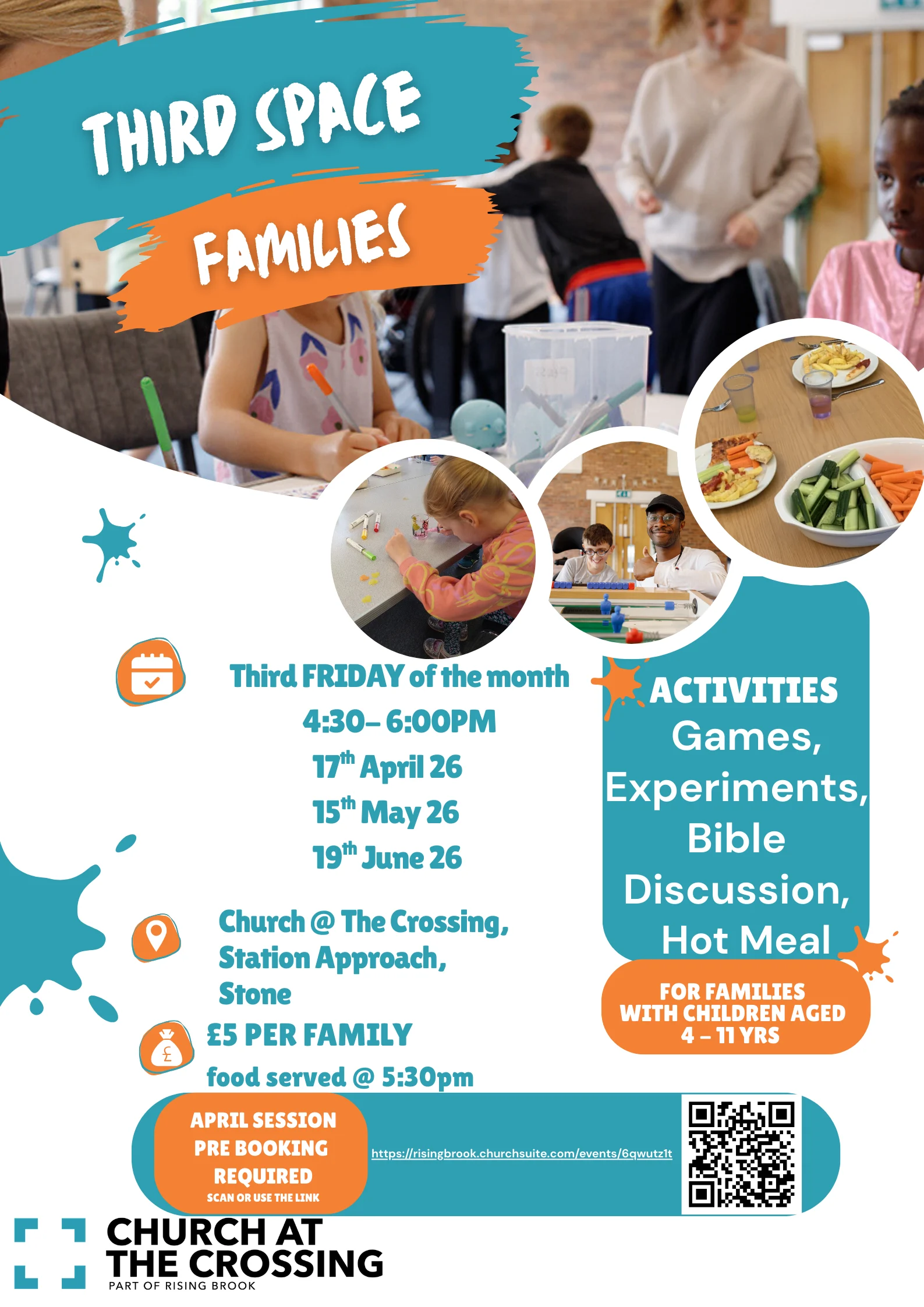 Third Space Families will be held at Church at The Crossing, Station Approach, on the third Friday of each month from 4.30pm to 6pm. The sessions are aimed at families with children aged four to 11.
