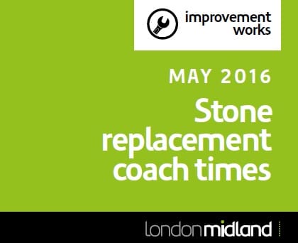 A rail replacement coach service will operate between Stafford, Stone and Stoke-on-Trent, connecting with train services towards London Euston and Crewe at Stoke-on-Trent.