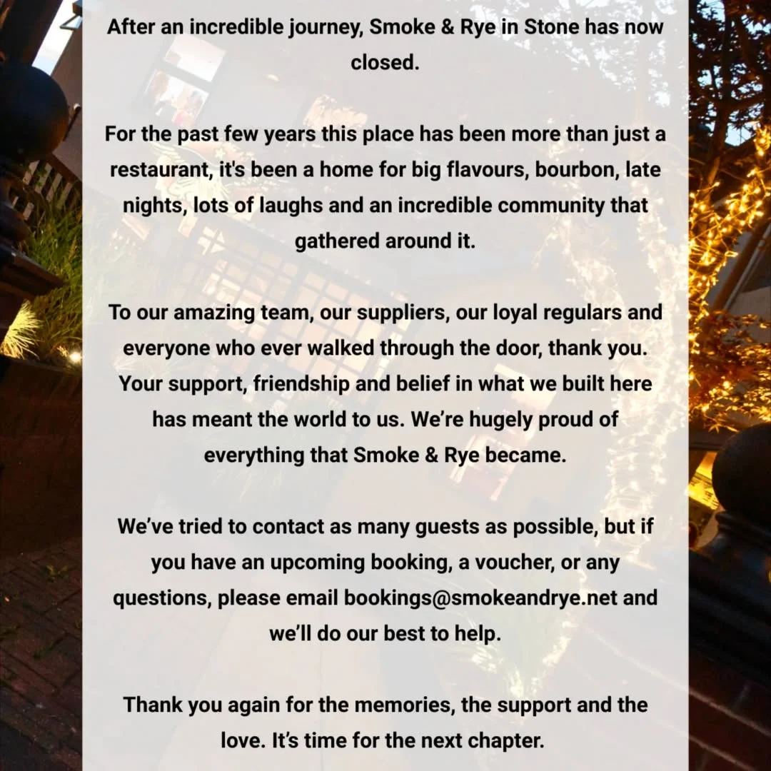 Smoke and Rye has announced it has closed its restaurant in Stone.