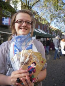 The young Stone actress who’s taking the title role in Stone Revellers’ Christmas production of Snow White was at the farmers’ market on Saturday 6th November to promote the show.