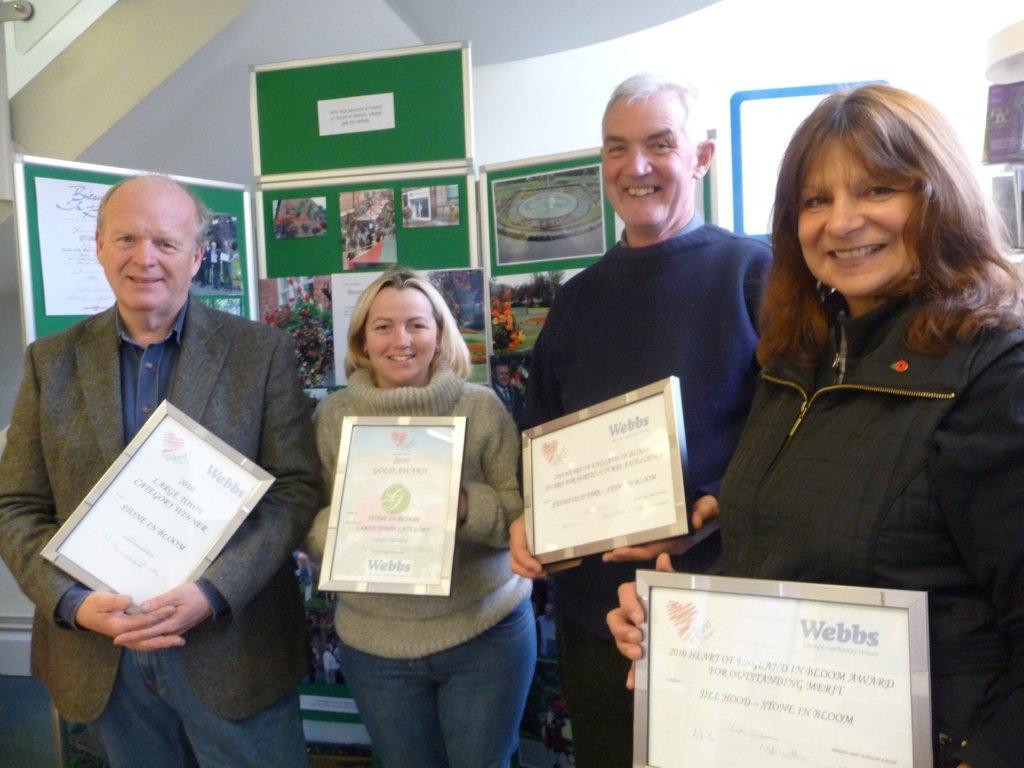 Stone in Bloom won gold for the third year running in this year’s Heart of England in Bloom awards, with Stonefield Park awarded a special merit award. And two members – Jill Hood and Martin Robinson – got their own special commendations for their sterling efforts.