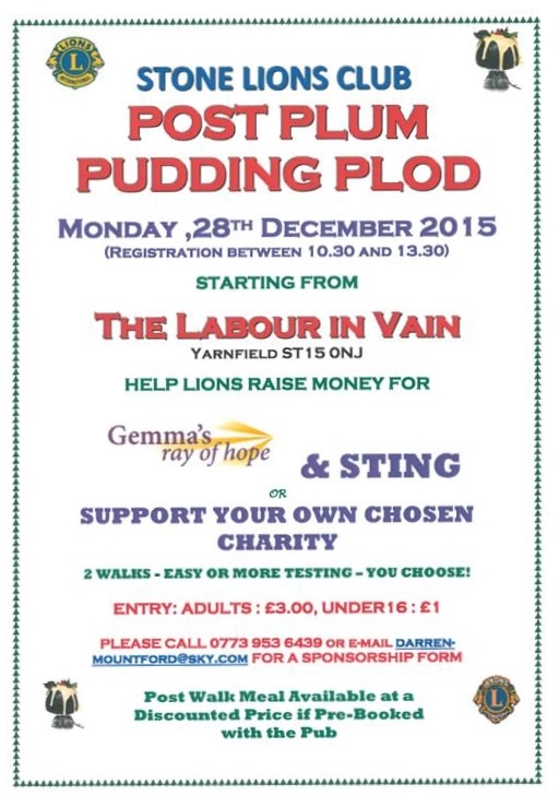 Stone Lions are hosting a charity walk to raise much-needed funds for epilepsy charity Gemma’s Ray of Hope in memory of Lally McColl, and Stone support group STING on Monday 28th December 2015.