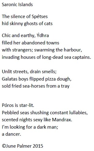 Three of June’s poems are below. Two – ‘Out of January’ and ‘Let the stone be firm’ – are from her book. The other, ‘Saronic Islands’, is a more recent offering…