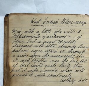 The handwritten recipe for West Indian Blanc-Mange is part of the latest project from Staffordshire County Council’s Archives and Heritage service, Meaningful Mementos, which aims to explore some of the everyday things people treasure. Often recipes are treasured heirlooms that are passed down through generations. Various people have contributed to the book with their own recipes, so it may have belonged to a family and used over several generations.