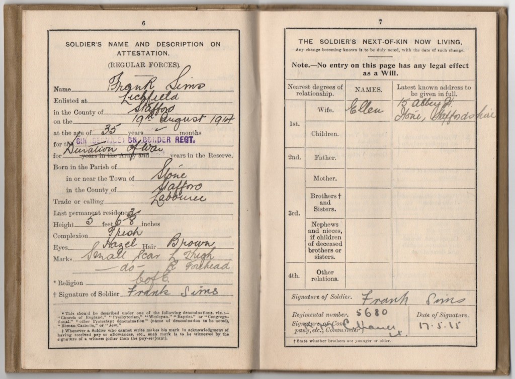 Pte Frank Sims 5680 lost his life in the Battle of the Somme, along with his brother Joe. In all, 20 men from Stone died in the Somme, and it is thought that 144 men in total from the town died over the course of the Great War.