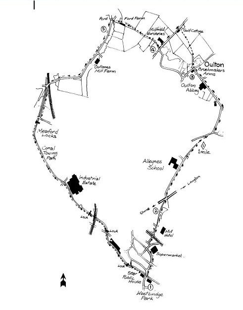 Proceed along the path until you reach the A520, Stone-Longton road. Cross the road diagonally right into Airdale Road, soon passing Alleynes School on the left. Enter Airdale Spinney at the top of the hill. Look for the footpath sign on the left within 100 yards. Follow the footpath behind the houses over a stile into a copse leading into Nicholls Lane. Cross the lane diagonally right, turning left into Church Lane, leading to Oulton village. Pass the Church of St. John the Evangelist on the left and, within 200 yards, Oulton Abbey, now a nursing home but previously a convent of the Benedictine Order founded in 1854 and providing education for young ladies at a school connected with the Abbey.