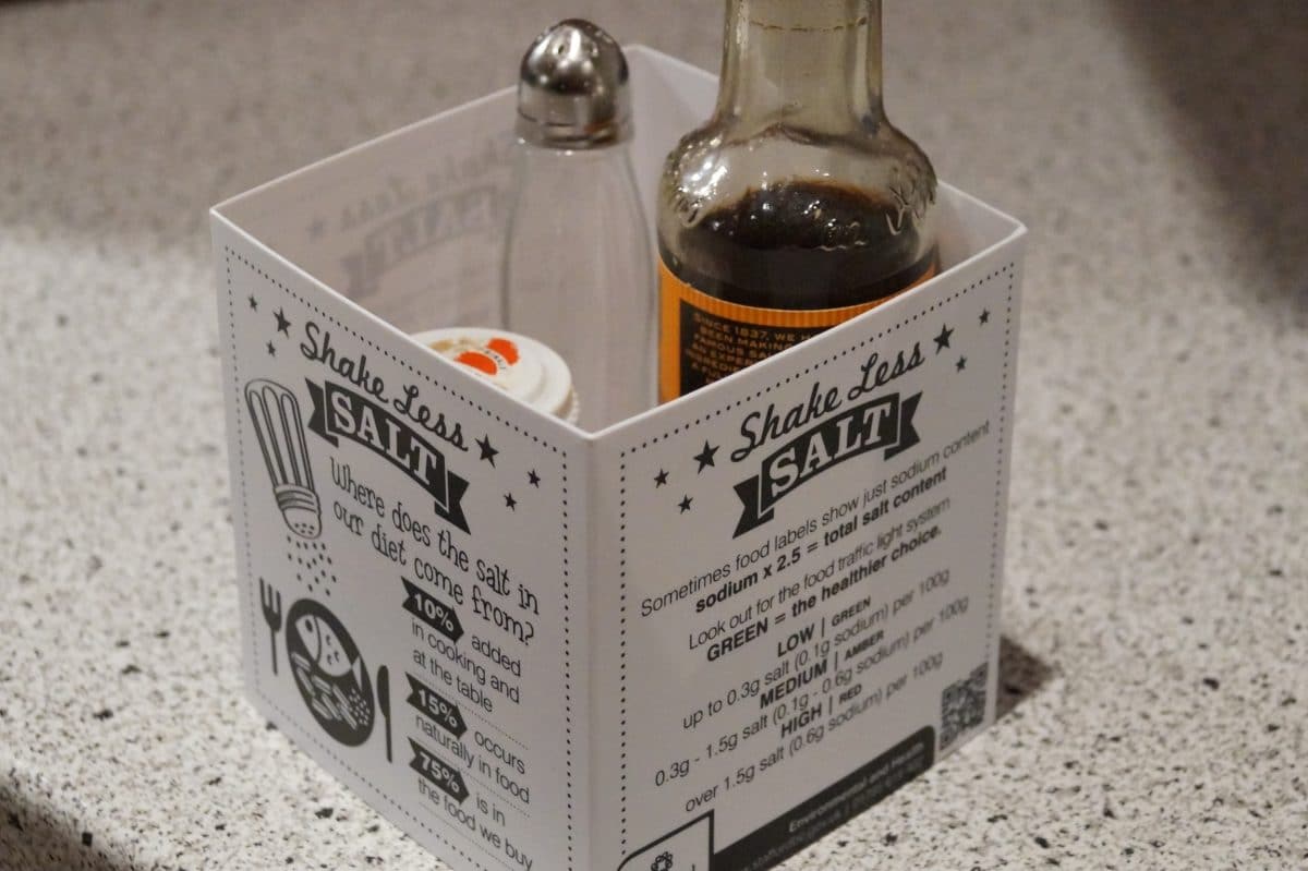 Now the four-sided, plastic educational table talkers will house the salt and other condiments on tables in around 30 restaurants and cafes in Stone. Advice includes the daily maximum amount of salt for different age groups as well as tips on what to look for on food packaging.