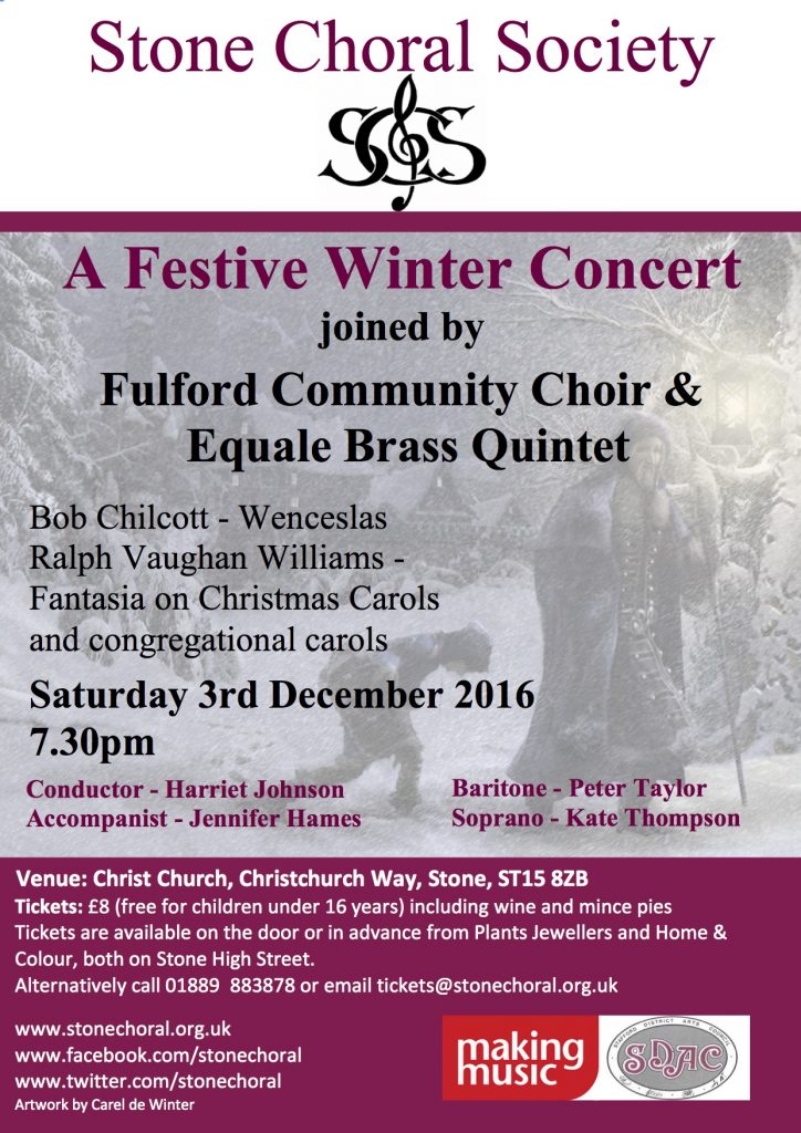 Saturday 3rd December sees a festive winter concert at Stone's Christ Church, given by Stone Choral Society. Conductor Harriet Johnson…
