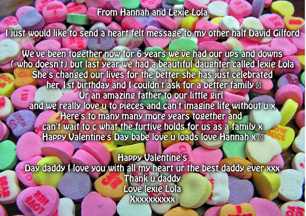 We asked for your Valentine messages for your loved ones, and you provided! And the winners of our prize of a 3 course meal for two with wine or cocktails at Let’s See Bistro are Ness & Jon Watt! Check below to see if your Valentine sent you a love note.