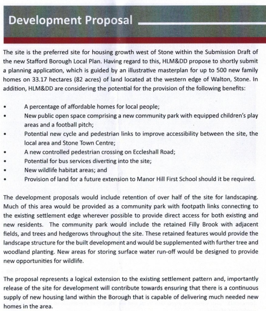I have just read the proposals from Hallam Land Management and Davidsons Development for 500 new houses in Walton. There are a few sweeteners such as a cycle path and a park but these tend to be de rigueur on most new estates. They say there will be affordable homes for local people but for economic reasons they cannot be cheaper than any similar new house in Stone and for reasons of discrimination law they cannot be sold ONLY to specific sections of society. All interested buyers must have an equal opportunity to buy. So they are offering nothing new really. I do wonder, and this is only my personal view, why Stafford Borough Council continues to build more and more houses in and around Stone. In the many years I have been associated with Stone less than a small handful of houses have been built in other wards of the Borough Council such as: