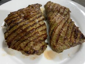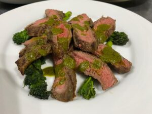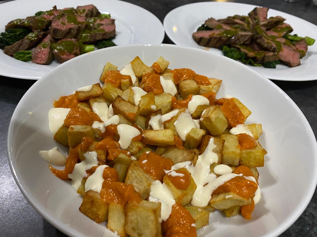 - Herb marinated Flat Iron Steak with a chimichurri sauce, purple sprouting broccoli and Patatas Bravas with aioli
