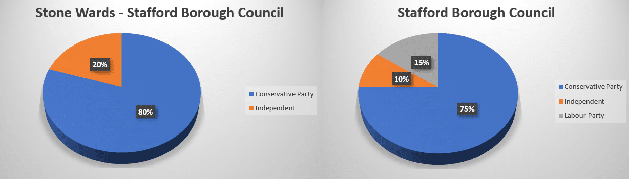 Stafford Borough Council is made up of 40 seats with 5 allocated to the town of Stone. As a whole Stafford Borough Council is split 30 Conservative Party seats, 6 Labour Party seats and 4 Independent seats.