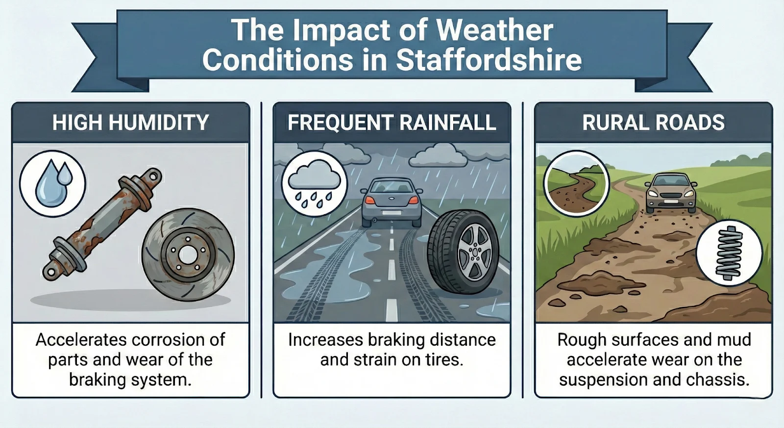 As the infographic above shows, Staffordshire’s climate and road network create three specific threats to your vehicle. High humidity, especially when combined with winter road salt, speeds up corrosion on brake discs, callipers, and suspension joints. Wet conditions increase braking demand and can accelerate tyre and pad wear. The region’s rural roads are often uneven, muddy, and poorly surfaced, which creates vibration and mechanical stress that shortens component lifespan.